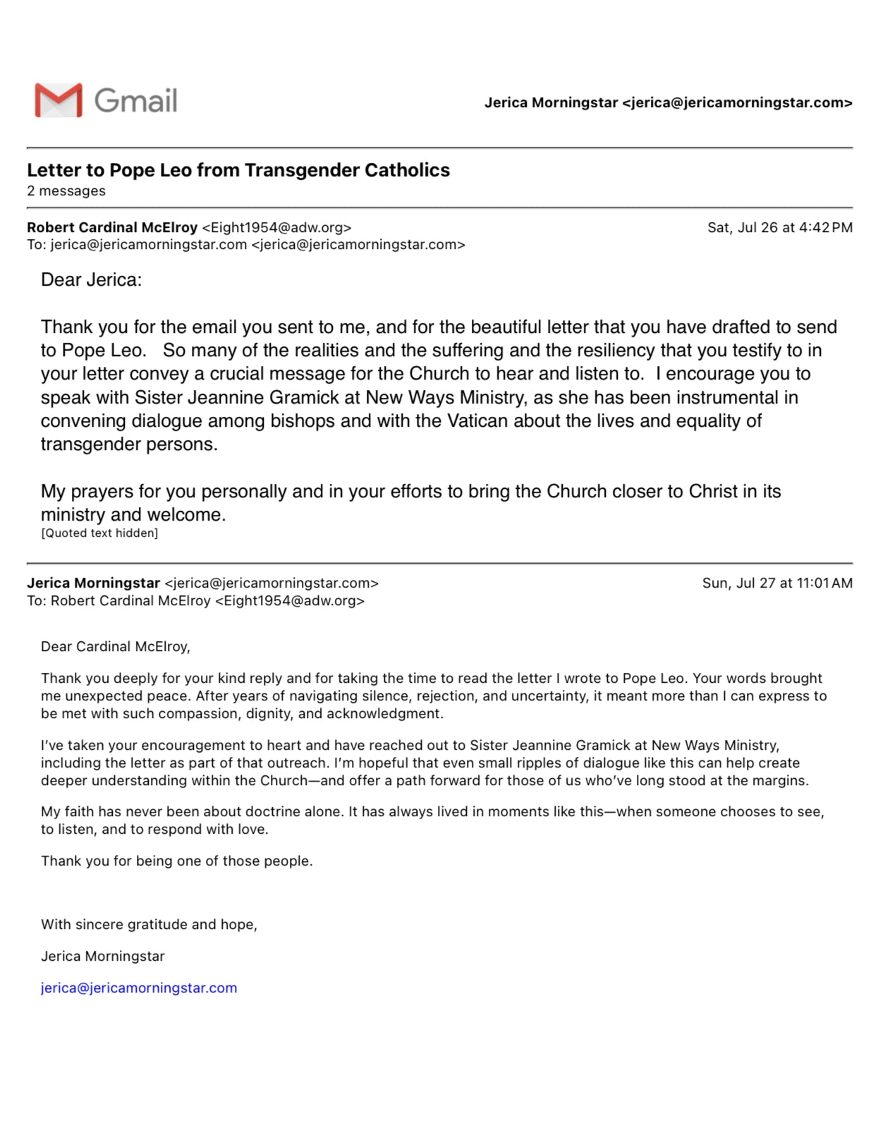 Email to Cardinal McElroy & Sister Jeannine